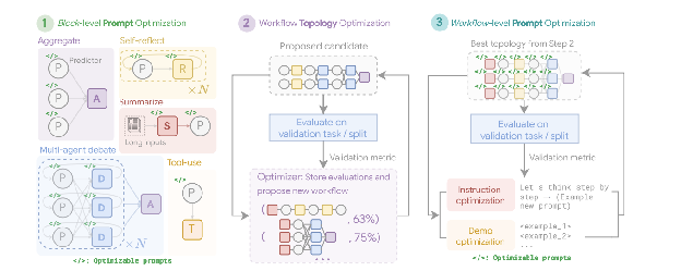 图 4:多智能体系统搜索(MASS)框架是一个三阶段优化过程,探索一个包含可优化提示(指令和演示)和可配置智能体构建模块(聚合、反思、辩论、总结和工具使用)的搜索空间。第一阶段,模块级提示优化,独立优化每个智能体模块的提示。第二阶段,工作流拓扑优化,从基于影响权重的设计空间中采样有效的系统配置,并整合优化后的提示。最后阶段,工作流级提示优化,在识别出第二阶段的最佳工作流后,对整个多智能体系统进行第二轮提示优化。