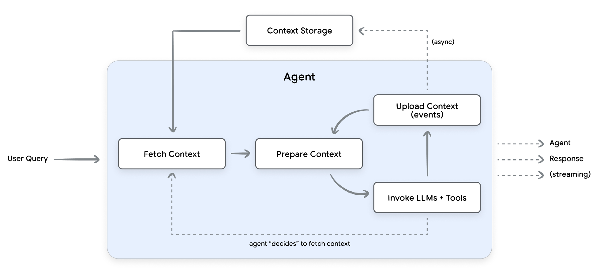 1. 获取上下文(Fetch Context):智能体首先检索上下文——例如用户记忆、RAG 文档和最近的对话事件。对于动态上下文检索,智能体将使用用户查询和其他元数据来识别要检索的信息。