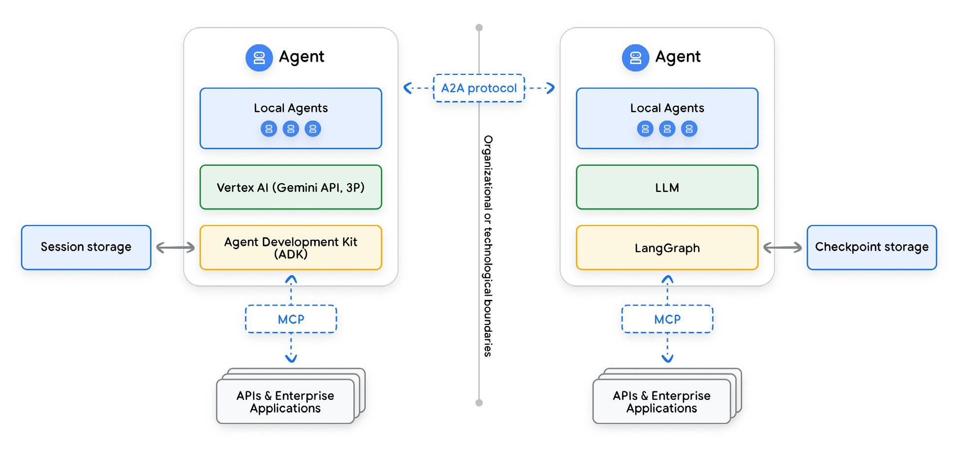 这种交互通常通过实现智能体即工具(Agent-as-a-tool)智能体到智能体(A2A)协议来实现。对于“智能体即工具”,一个智能体像调用标准工具一样调用另一个智能体,传递输入并接收最终的、自包含的输出。对于“智能体到智能体(A2A)协议”,智能体使用结构化协议进行直接消息传递。