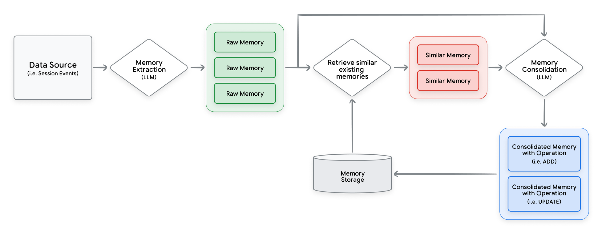 - 记忆被持久化(Memories are persisted):该服务将最终的记忆——这可能是新条目或对现有条目的更新——写入专用的、持久的数据库。对于托管记忆管理器,存储是内置的。