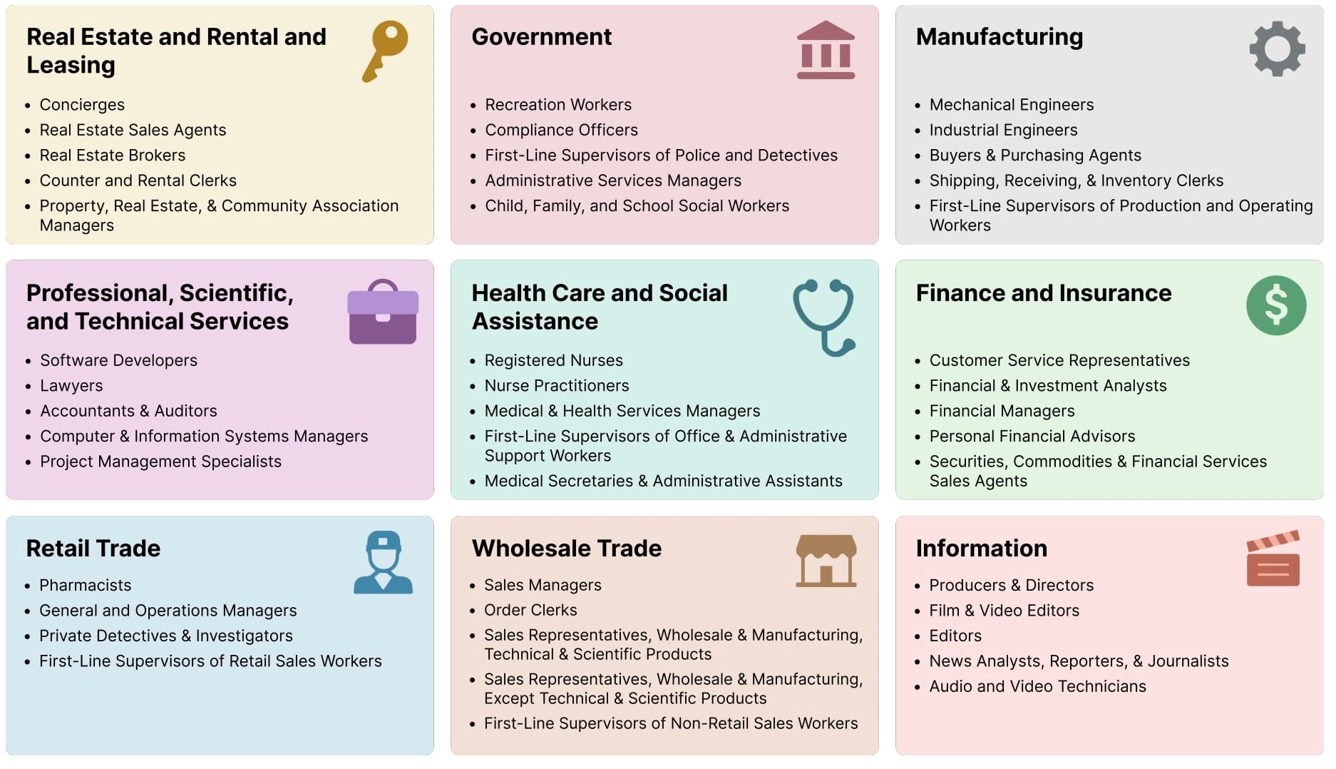 - 筛选高价值职业: 在每个行业中,挑选出总薪酬最高且主要从事“数字化工作”的5个职业,共计44个职业。这里的“数字化工作”是基于对美国劳工部O*NET数据库中任务数据的严谨分析,并根据相关性、重要性和频率等因素加权得出的。