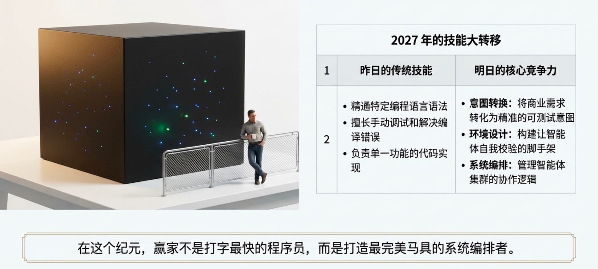 - 驾驭工程时代 (2026):关注整个执行环境和系统行为。开发者不再仅仅是好的提示词作者,而是成为了驾驭工程师,设计能够让多步系统稳定运行的认知基础设施 。