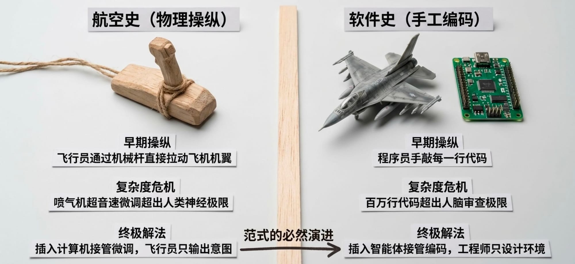 | 代码编写主体 | 人类工程师 (AI 提示补全) | AI 智能体 (根据环境约束自主生成) |