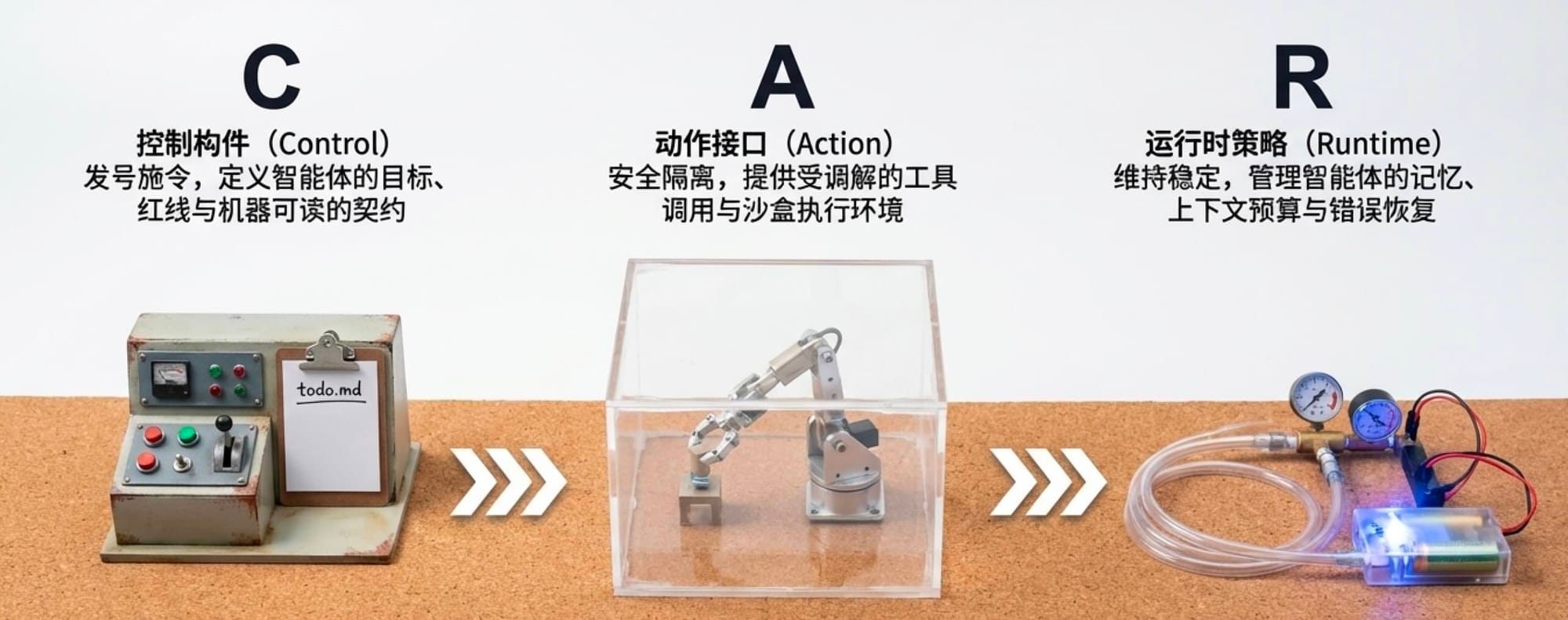 为了系统化地理解驾驭工程,研究界提出了 CAR 分解模型,即将驾驭层划分为控制(Control)、动作(Action)和运行时(Runtime)三个维度。这种结构化方法确保了智能体的行为既是受控的,又是可验证的。