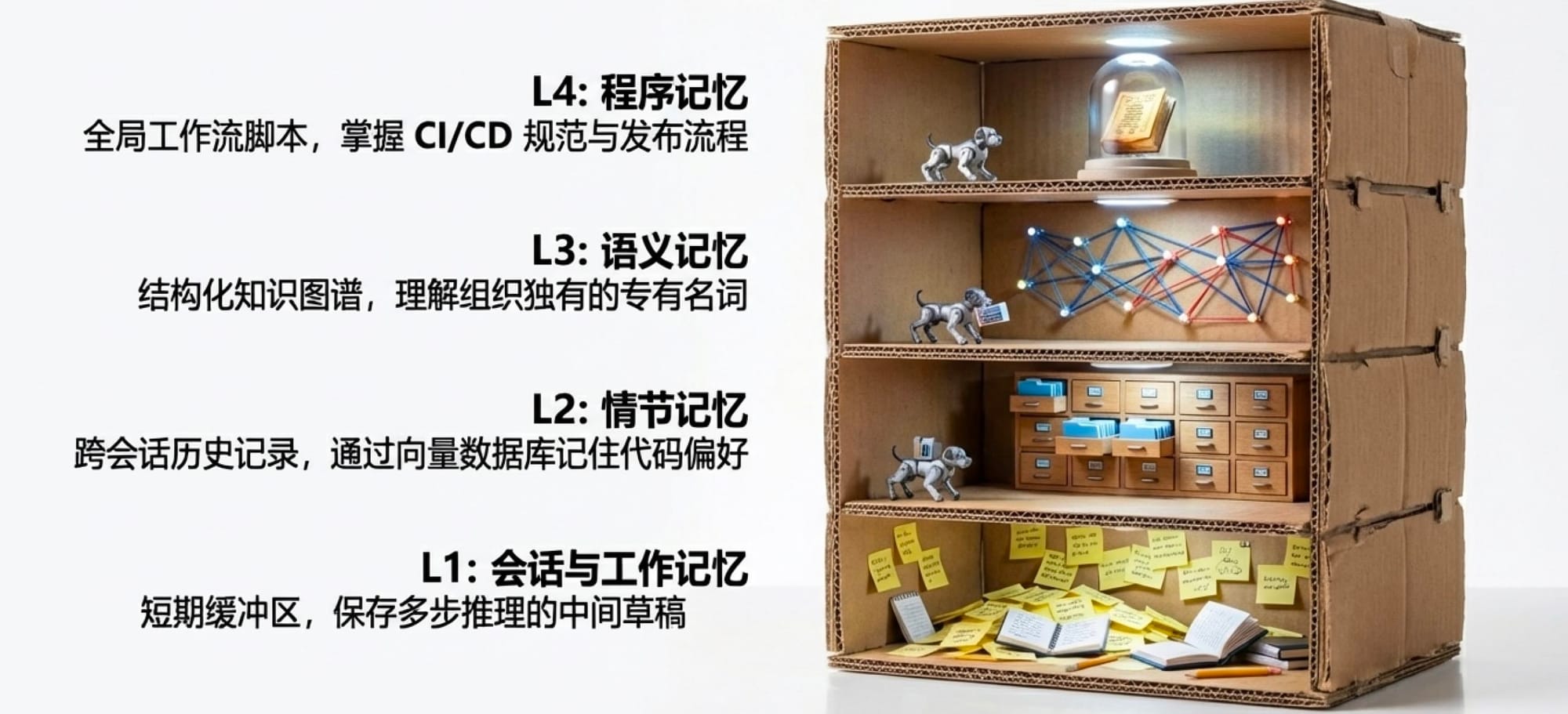 | 程序记忆 | 全局工作流。 | 工具定义、示例、工作流脚本。 | 掌握组织特有的开发规范和发布流程。 |