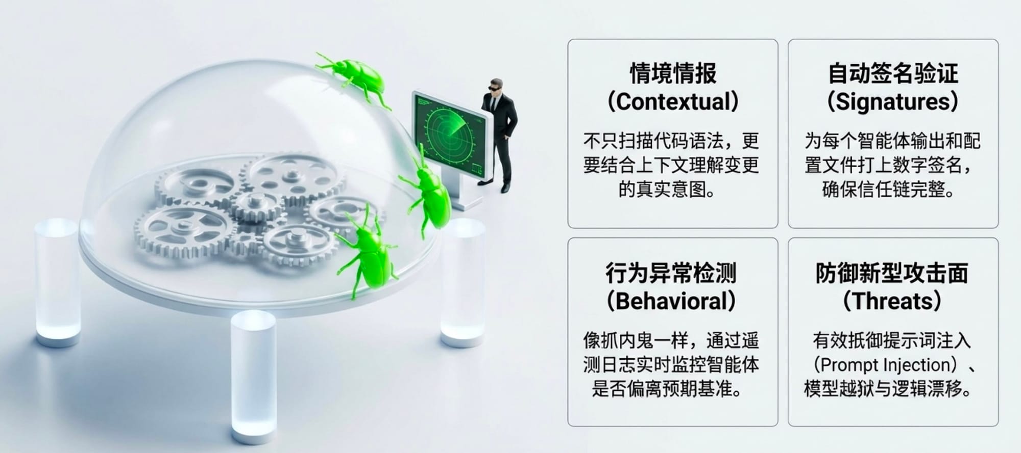 - 持续学习循环:利用真实的流水线数据不断强化防御规则。每发生一次事件,系统都会自动更新验证策略,使“安全”定义能够动态进化 。