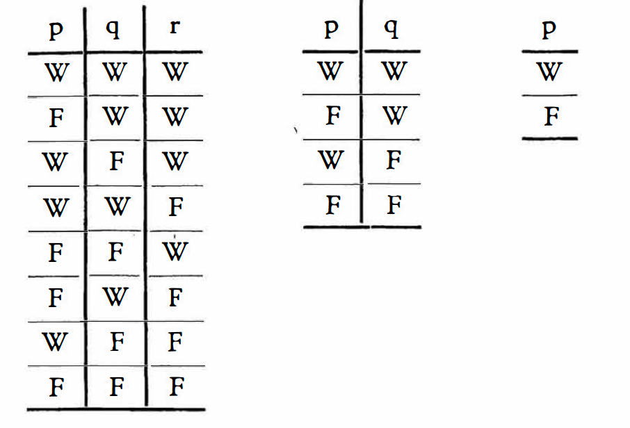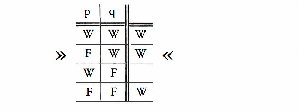 6.1203 为了识别一个表达式是否是同义反复,在其中没有普遍性符号(generality-sign)出现的情况下,人们可以使用以下直观方法:我用‘TpF’、‘TqF’、‘TrF’等代替‘p’、‘q’、‘r’等。我通过括号表达真值组合(Truth-combinations),例如,我使用线条来表达整个命题的真假与它的真值论证的真值组合之间的关联,方式如下:因此,例如,这个符号将代表命题 p ⊃ q。现在,举例来说,我想检验命题 P(p . Pp) (矛盾律)以确定它是否是一个同义反复。在我们的符号体系中,形式‘PE’被写为,形式‘E . η’被写为。因此,命题 P(p . Pp) 读作如下:如果我们在此用‘p’替换‘q’并检验最外层的 T 和 F 如何与最内层的 T 和 F 连接,结果将是整个命题的真与它论证的所有真值组合相关联,而它的假与任何真值组合都不相关联。