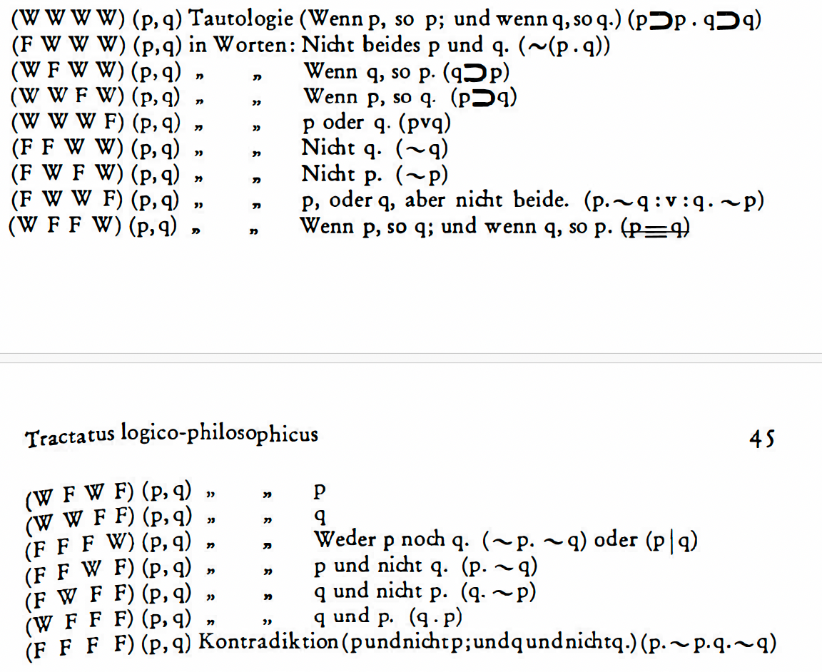6.1221 例如,如果两个命题‘p’和‘q’在组合‘p ⊃ q’中产生一个同义反复,那么 q 跟随于 p 是清楚的。例如,我们可以从这两个命题本身看出‘q’跟随于‘p ⊃ q . p’,但也可以用这种方式来展示它:我们将它们组合成‘p ⊃ q . p :⊃: q’,然后展示这是一个同义反复。